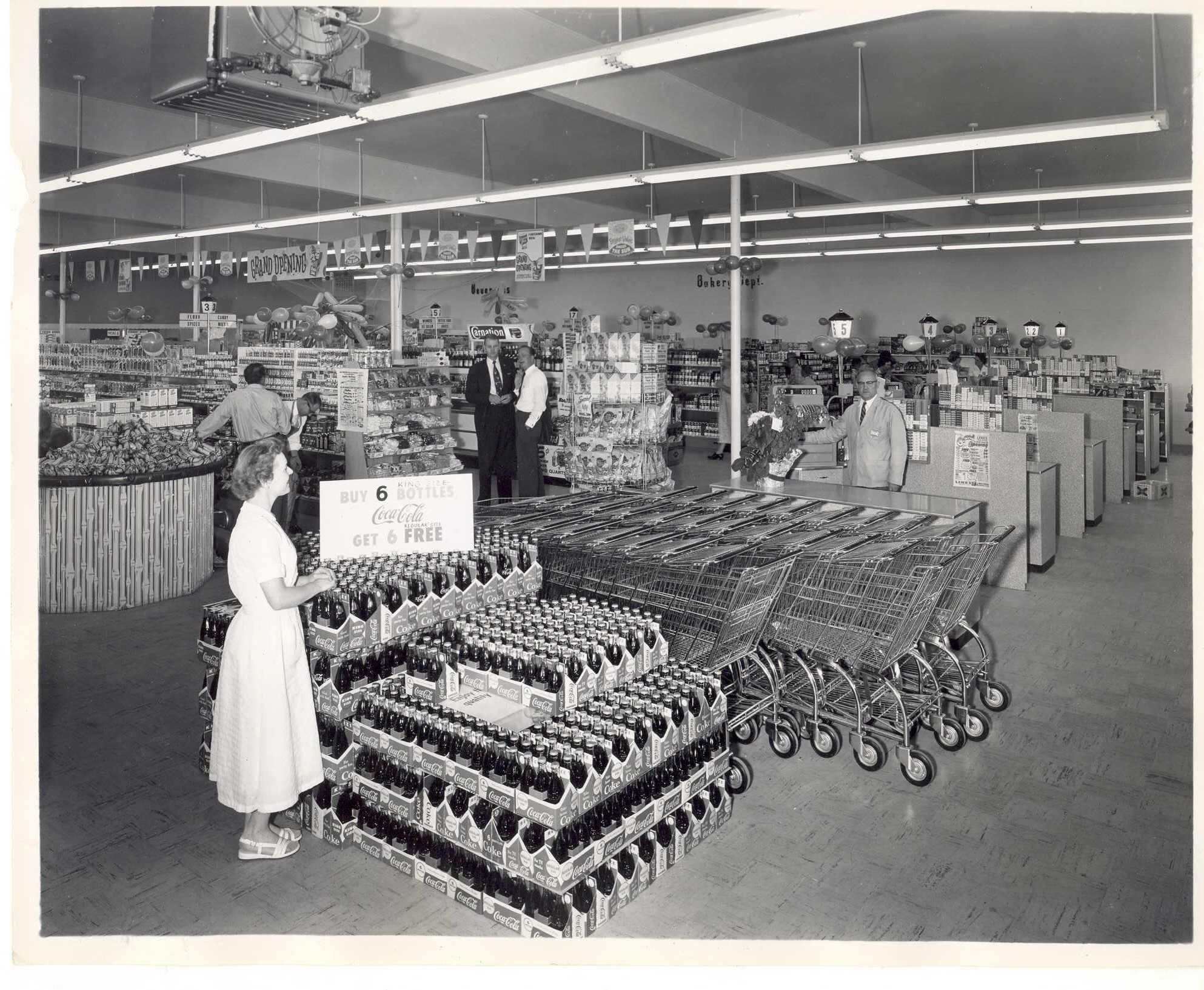 1957 Lamb’s Thriftway grand opening. Forrest Lamb stands at first checkout register. Courtesy Colin Lamb. See Colin Lamb.