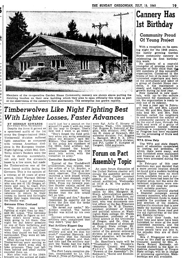 Oregonian July 13, 1945 page 19 article about the Garden Home Co-Op Cannery