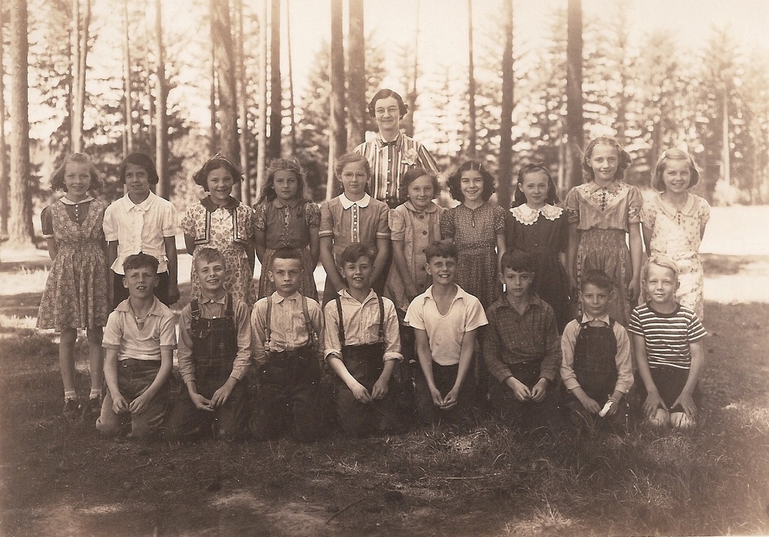 1938 Garden Home Grade School, 3rd and 4th grades. Teacher, Miss Waltman. Front row, L to R: Bill May 4th, _______, _______, Harry Feldman 3rd, ___________, Clark Stephens 4th, _________ Jim Bernard 3rd.Back row, L to R: Barbara Lyons 3rd, _________, Shirley Redding 3rd, Alice Burns 4th, Ann Coey 3rd, Rosella Niebert 3rd, Lou Anne Hickman 3rd, Madeline Koester 4th, Betty Schaefer 4th, Evelyn Knudsen 4th