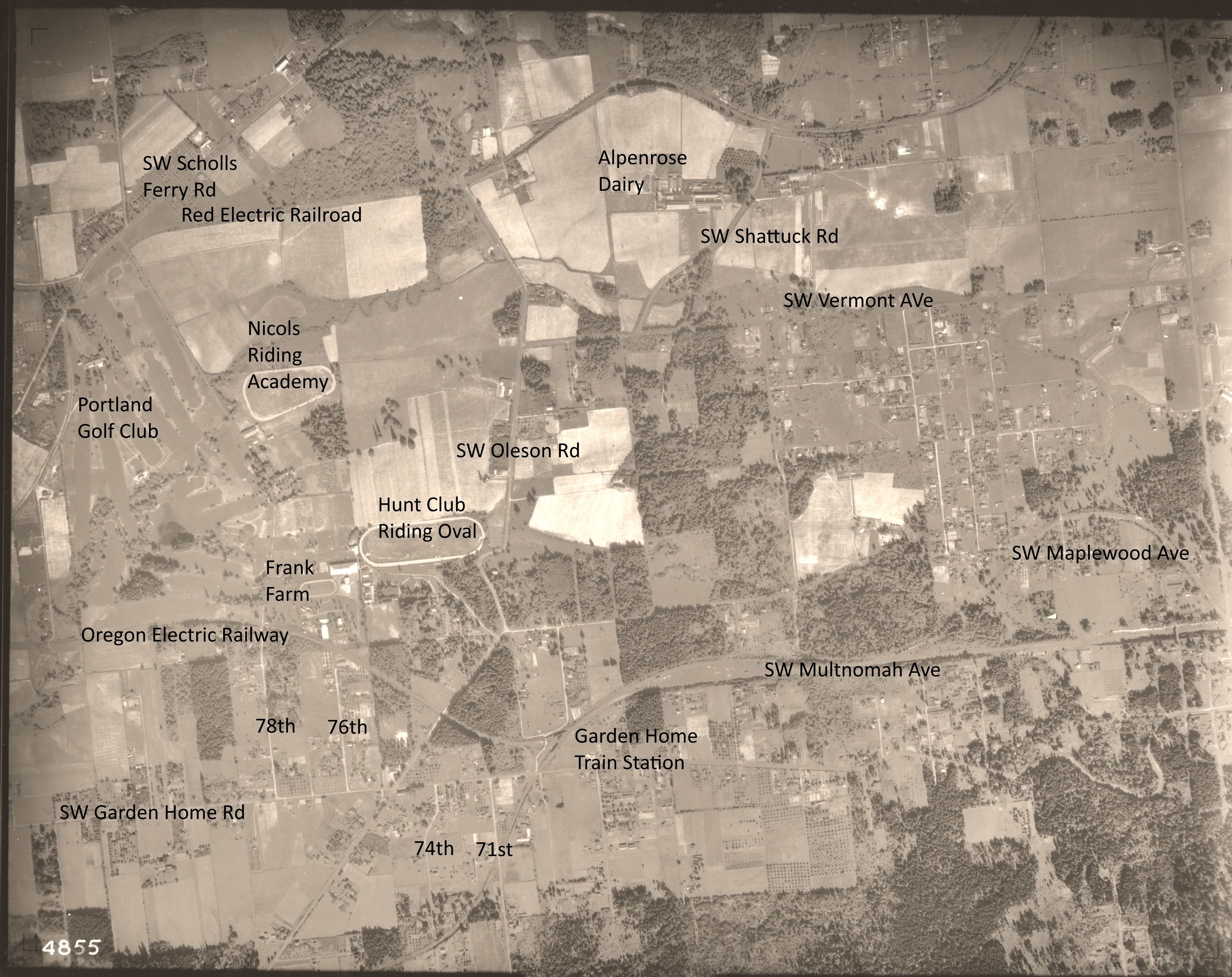 SW Garden Home intersection and train station – 1936 Army Corps of Engineers aerial photo (annotated)