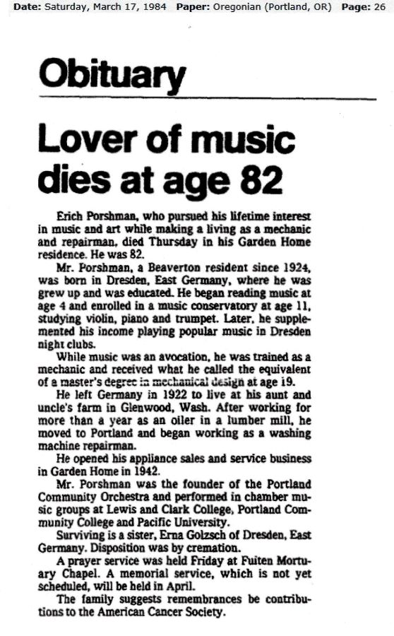 Obituary for Erich Porshman