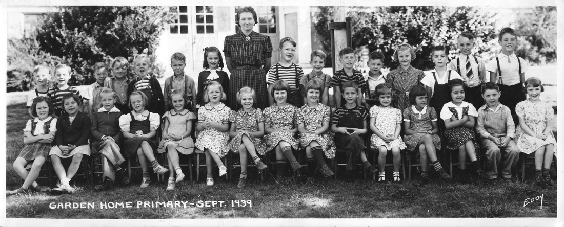 1939 Garden Home School, primary grades. Leo Feldman in top row next to teacher, Zora & Sharka Becvar, center front row.