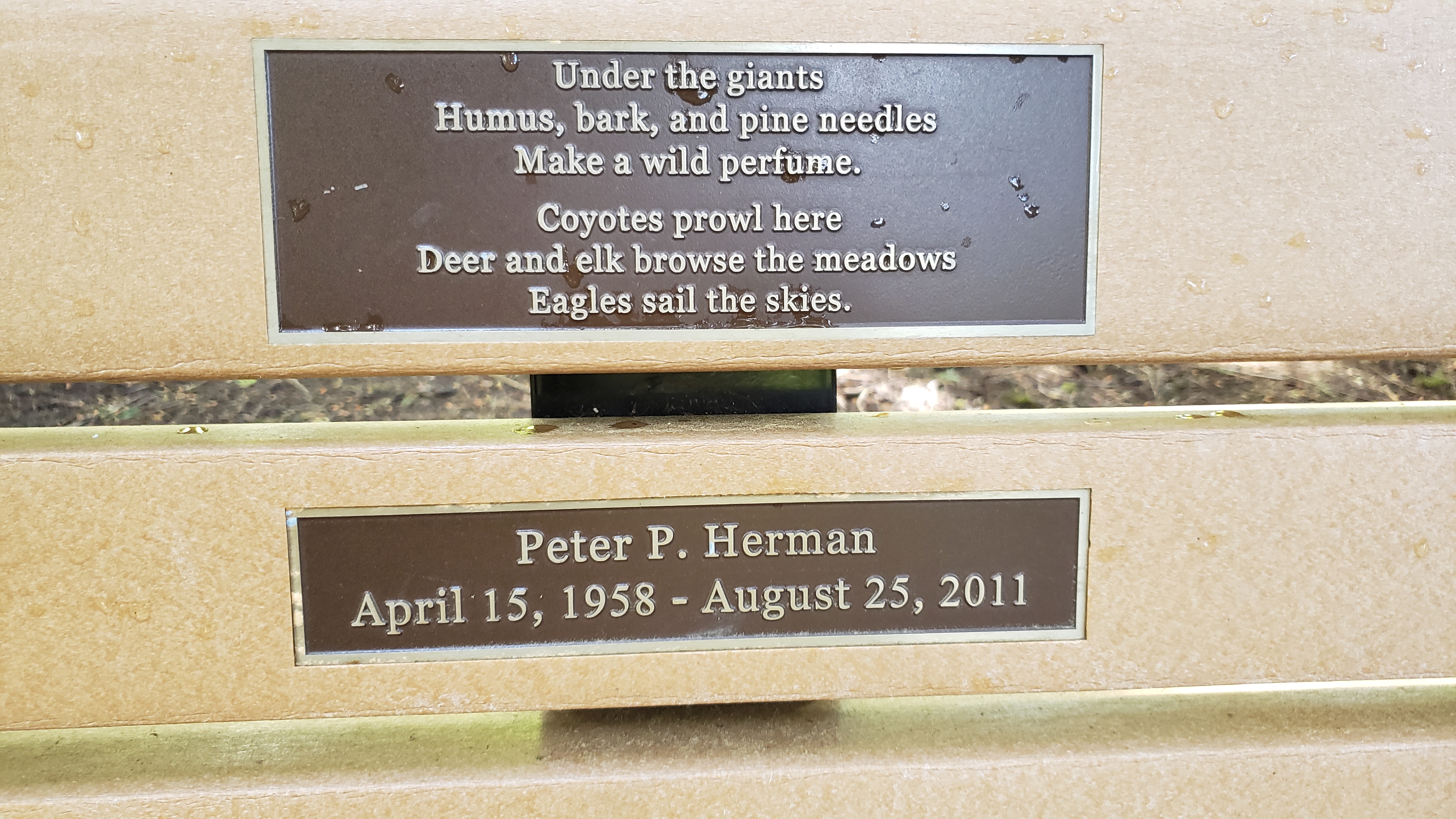 Peter Herman memorial bench inscription – on Fanno Creek Trail