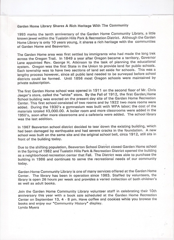 In 1994, the Garden Home Community Library Association was incorporated. That same year, the Association petitioned and received some funding from the Park District and Washington County. This enabled the Association to install a computerized circulation system and hire a part time manager. In 1996, the Association requested, and was granted, acceptance into the Washington County Cooperative Library Services system providing all the benefits of the cooperative including a stable source of funding. Since that time, usage has increased five-fold. Recognizing the need for growth, the Association completed, in April 2004, a $245,000 expansion project funded by donations from the Board, the community, and several institutional grants. The expansion doubled the size from 930 to 1886 square feet and transformed what was originally two classrooms into an expanded, dynamic, full-service library facility.