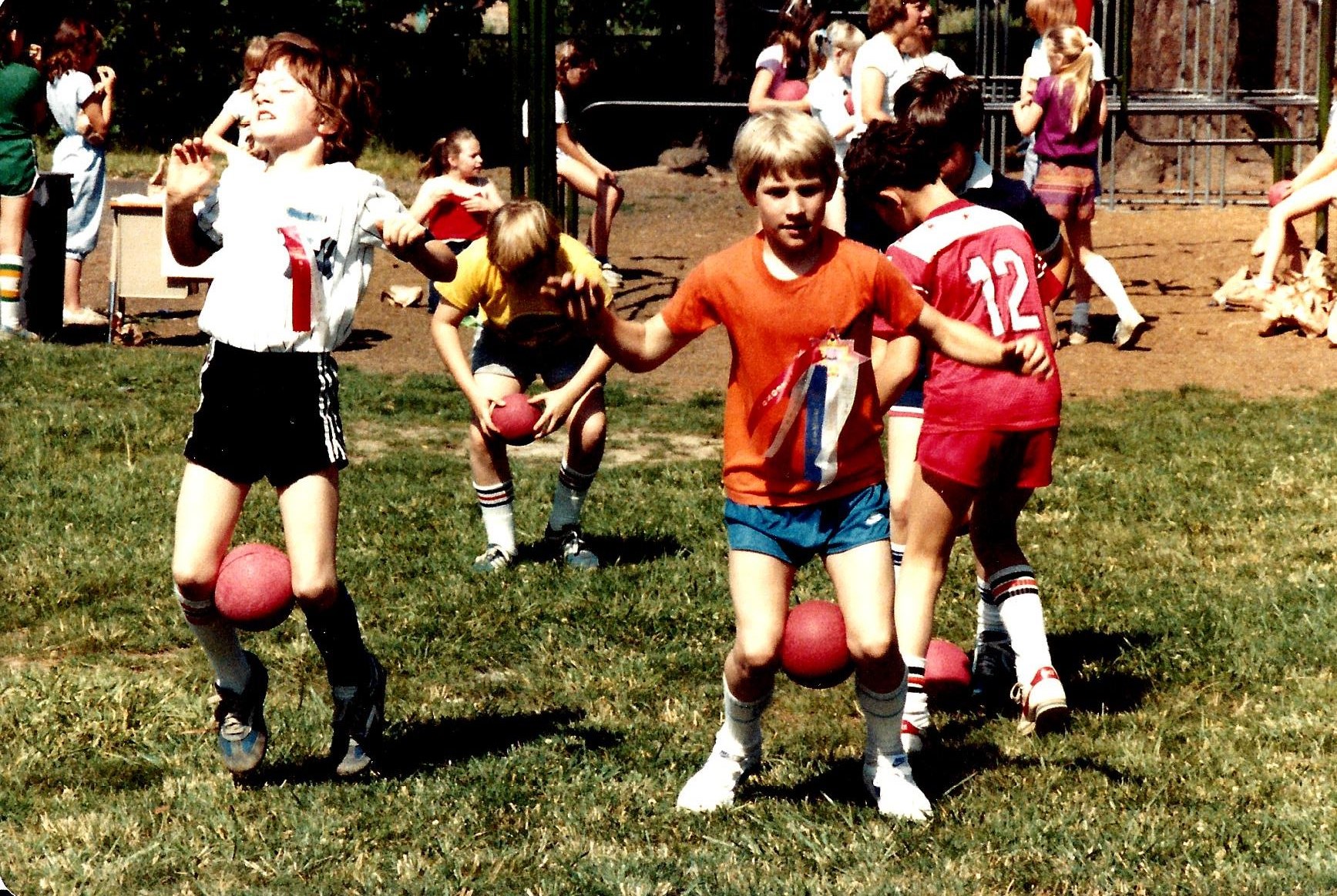 1982 Final day of Garden Home School – Field Day event with kids carrying balls between their knees