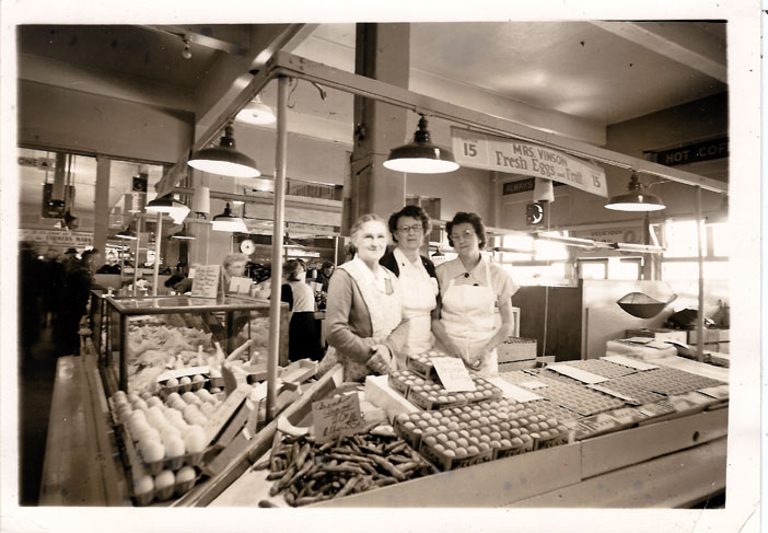 Theresa Boyd Upchurch in downtown Portland market booth, circa 1950