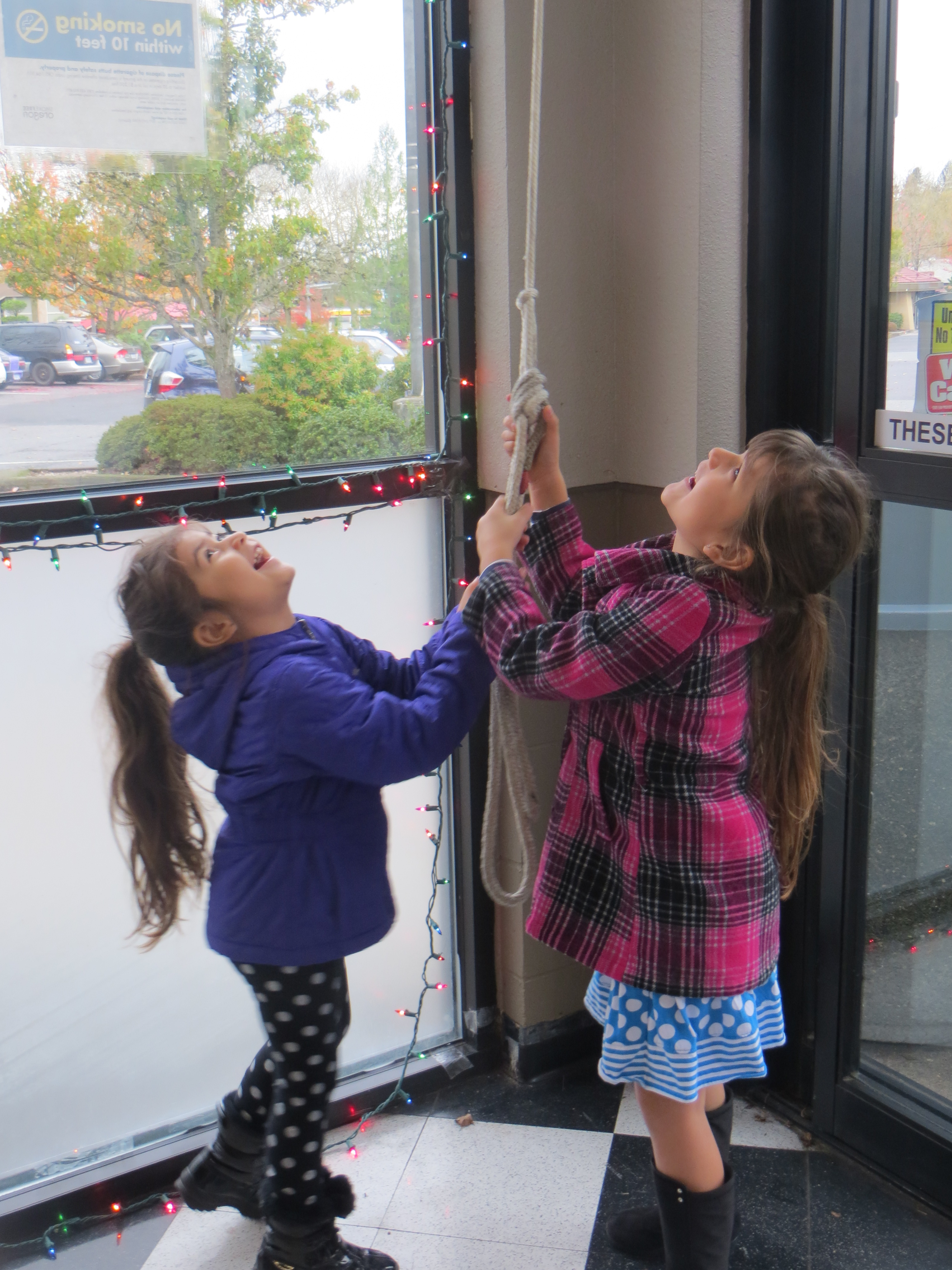 Two girls ringing the bell at the Garden Home Market Place, 2015