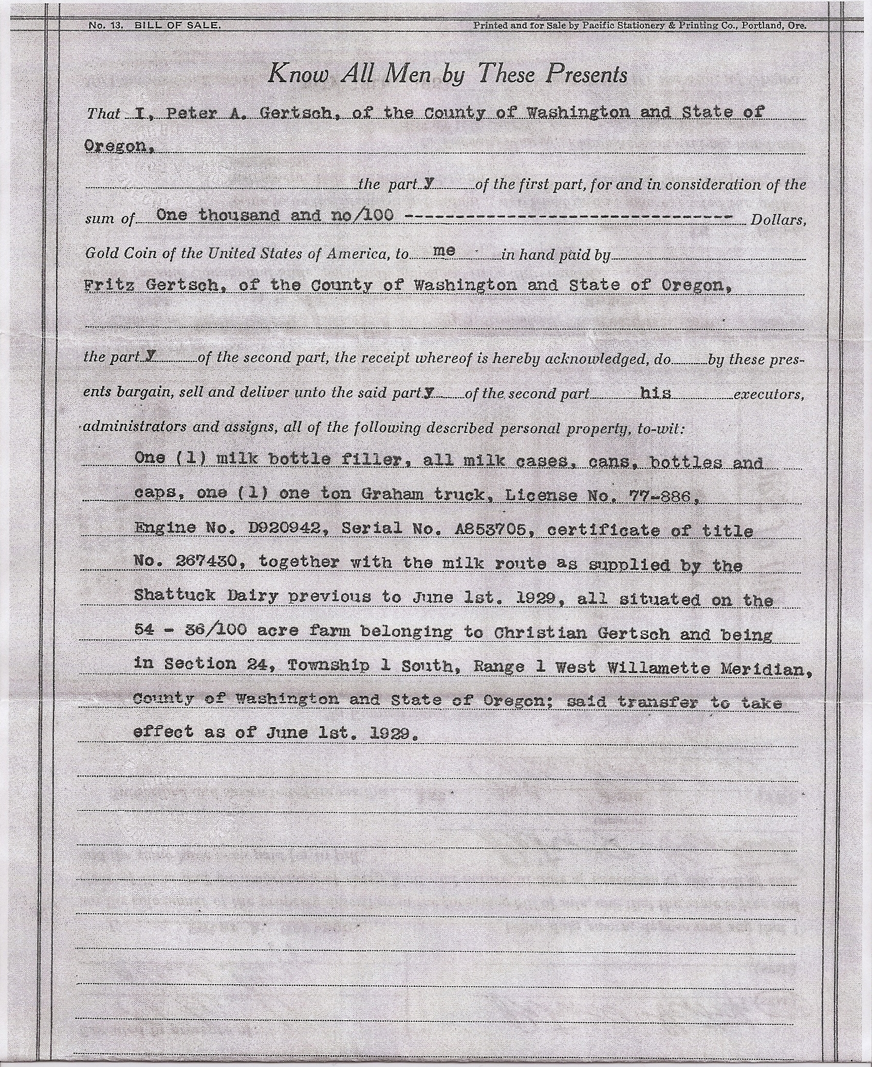 1929 sale by Peter Gertsch of milk route and equipment (part 1)