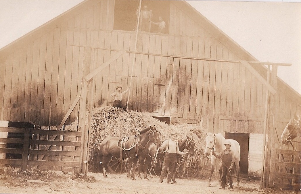 Shattuck Dairy – haying, 2 men above hay mow