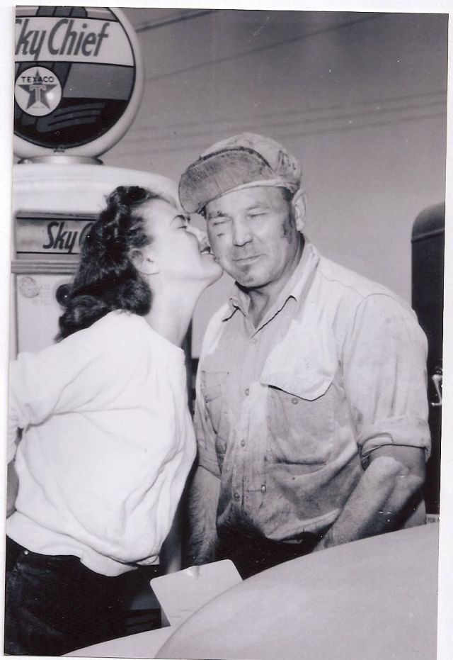 1945 Dorothy Johnson in front of Gust Johnnson’s gas station, FDR death.
