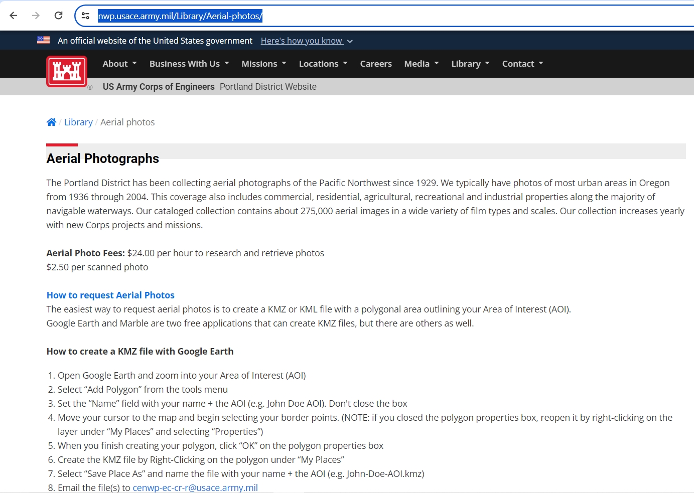 US Army Corps of Engineers – requesting aerial photography – screenshot